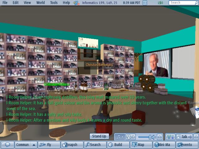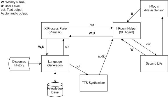 an "intelligent room" or "knowledgeable room" to act as a knowledge aid to support collaborative teleconferences and meetingsOne of I-Room's main components is the I-Room Helper. The Helper acts as an agent between Second Life and the real world that passes the requests of the avatars to the process panel (and in turn to the I-X Planner) and delivers messages from the external system to the room (e.g. turning on screens to show a video or writing a chat message to the avatars in the room). In this project the I-Room Helper will be used to provide the external system with the whisky name string and to deliver the NLG output in the form of written tasting notes and audio.