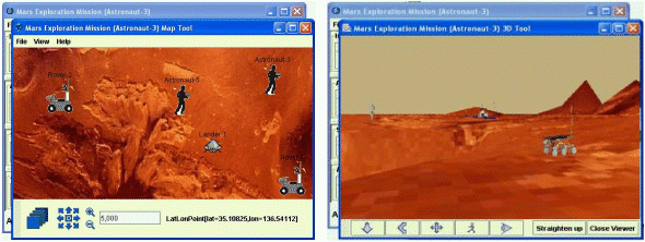or more exploration teams, which are composed of a lander, two rovers (r1 and r2) and two astronauts (a1 and a2). Orbiters provide some auxiliary services. In our example there are two principal objectives for each exploration team: studying the surface of